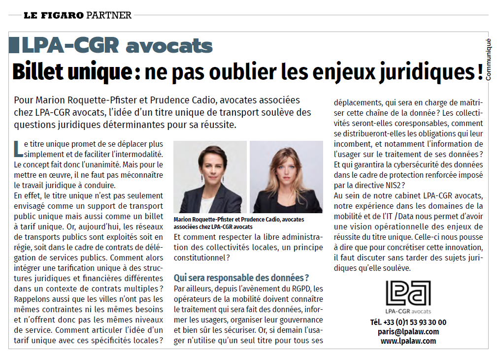 Dans cet article paru dans Le Figaro Partner, Marion Roquette-Pfister et Prudence Cadio, avocates associées responsables du secteur Mobilités, expliquent comment l’idée d’un titre unique de transport soulève des questions juridiques déterminantes pour sa réussite.
